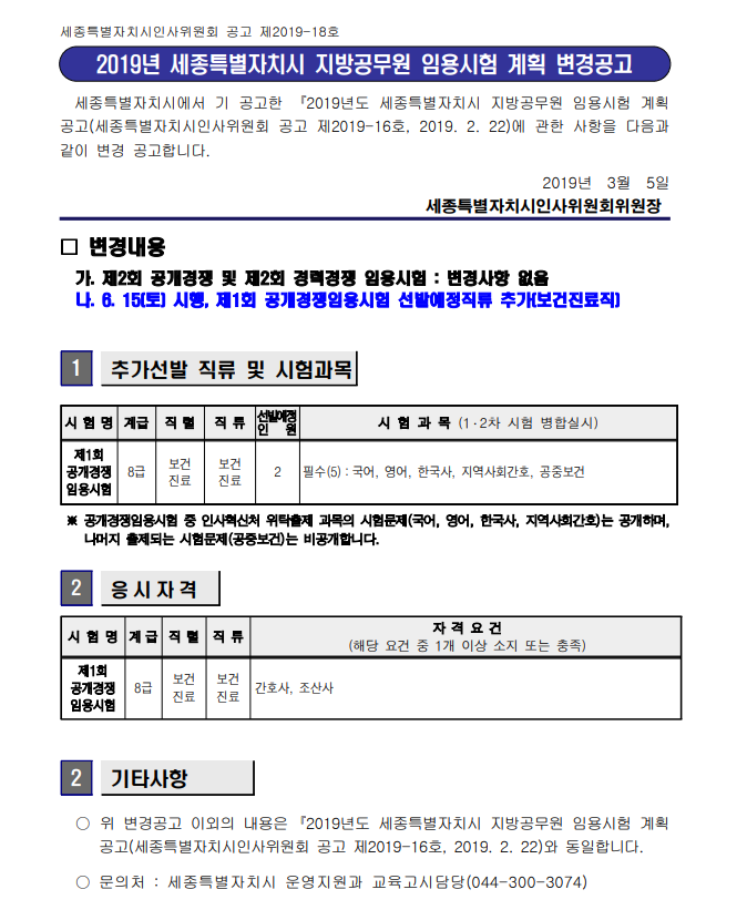 Á¦¸ñ 2019³â ¼¼Á¾Æ¯º°ÀÚÄ¡½Ã Áö¹æ°ø¹«¿ø ÀÓ¿ë½ÃÇè °èȹ º¯°æ°ø°í