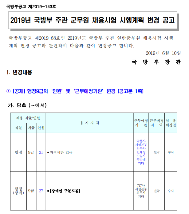 Á¦¸ñ 2019³âµµ ±¹¹æºÎ ÁÖ°ü ±º¹«¿ø ä¿ë½ÃÇè ½ÃÇà°èȹ º¯°æ °ø°í