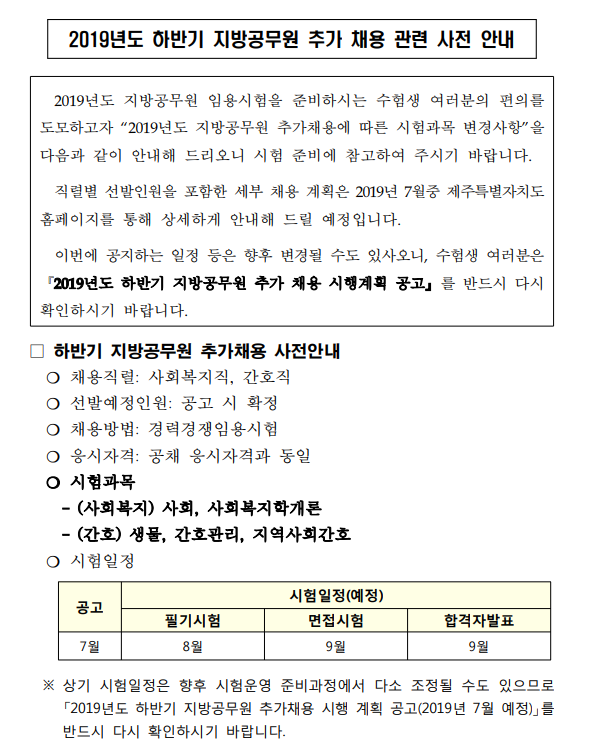 Á¦¸ñ 2019³âµµ ÇϹݱâ Á¦ÁÖµµ Áö¹æ°ø¹«¿ø Ãß°¡ ä¿ë °ü·Ã »çÀü ¾È³»