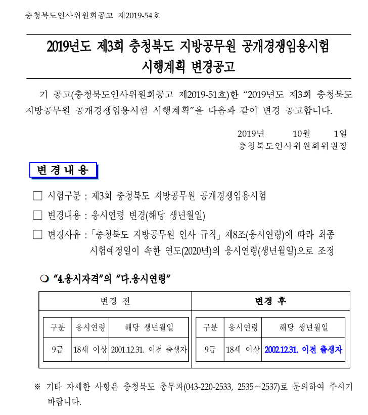 Á¦¸ñ 2019³âµµ Á¦3ȸ ÃæÃ»ºÏµµ Áö¹æ°ø¹«¿ø °ø°³°æÀïÀÓ¿ë½ÃÇè ½ÃÇà°èȹ º¯°æ°ø°í(ÀÀ½Ã¿¬·É)