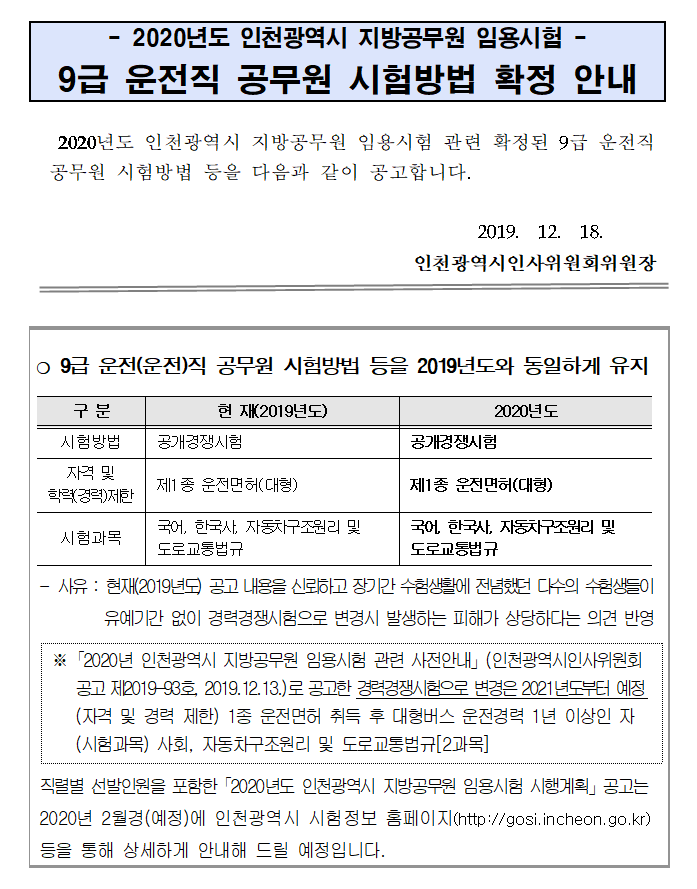 Á¦¸ñ 2020³â ÀÎõ±¤¿ª½Ã 9±Þ ¿îÀüÁ÷ ½ÃÇè¹æ¹ý È®Á¤ ¾È³»