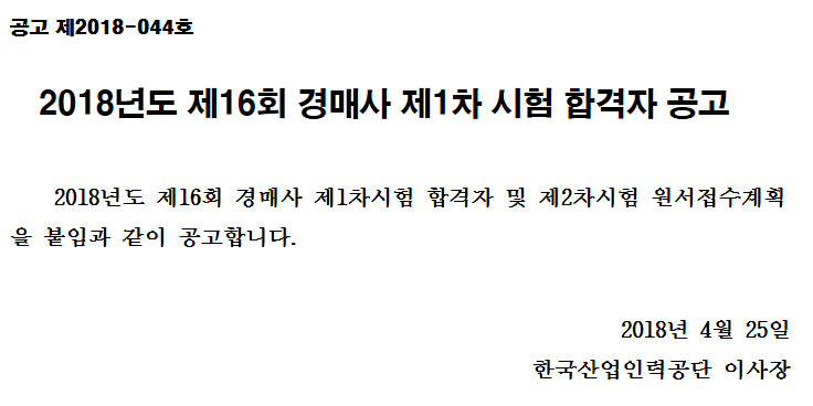 Á¦¸ñ 2018³âµµ Á¦16ȸ °æ¸Å»ç Á¦1Â÷½ÃÇè ÇÕ°ÝÀÚ ¹ßÇ¥